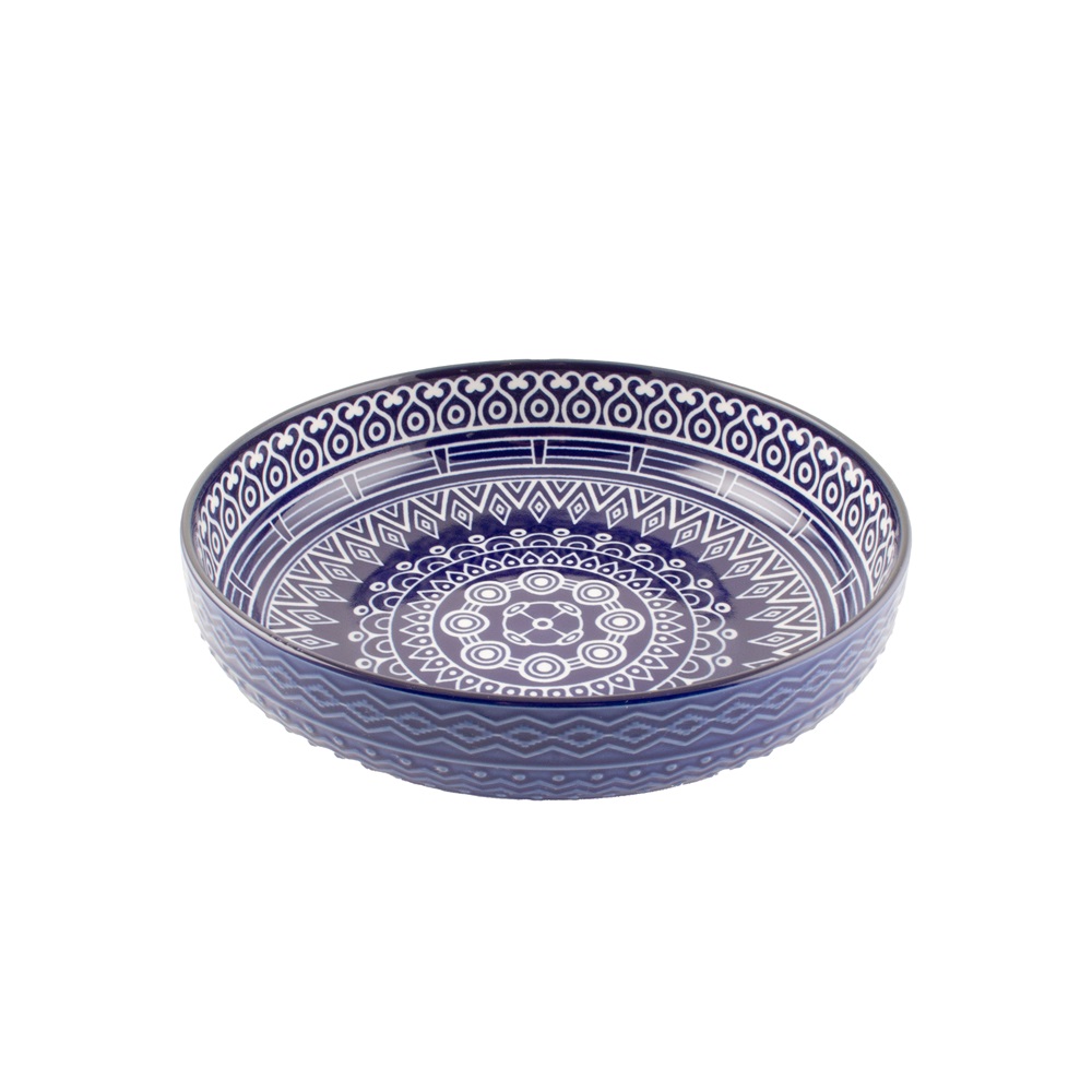 L'insalatiera Sardinia da 23,5 cm, in fine porcelain, unisce la praticità di un formato capiente con una decorazione blu su bianco di suggestivo impatto visivo. La superficie, arricchita da motivi floreali e geometrici tipici della tradizione sarda, trasforma ogni portata in un piccolo evento mediterraneo. Perfetta per insalate, frutta o piatti unici, vanta un bordo ampio e una forma armoniosa particolarmente adatta alle tavole conviviali, garantendo inoltre resistenza, brillantezza e perfetta impilabilità per uso domestico e professionale.