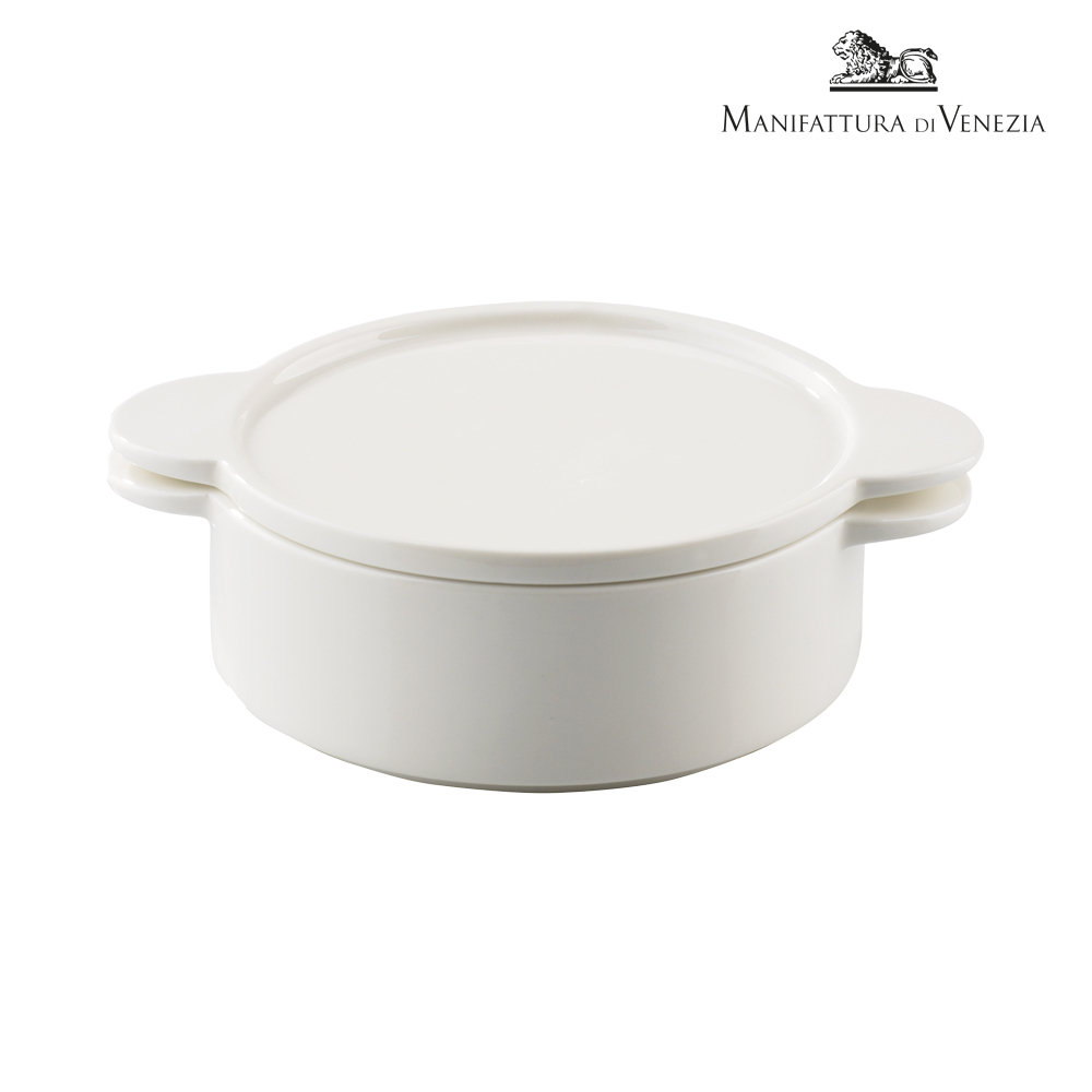 Accessorio duttile e raffinato per chef, Horeca e cucine contemporanee. Il coperchio/vassoio rotondo bianco Pyro Surprise da 24x18 cm è realizzato in vitreous bone porcelain avorio, sinonimo di eleganza e durata. Perfetto come coperchio per pirofile, vassoio per mise en place scenografiche o sottopirofila, resiste a shock termici, graffi, lavastoviglie e si impila con precisione grazie al suo design brevettato. Un elemento multifunzione che coniuga organizzazione, estetica e infinite possibilità di servizio in un solo gesto.