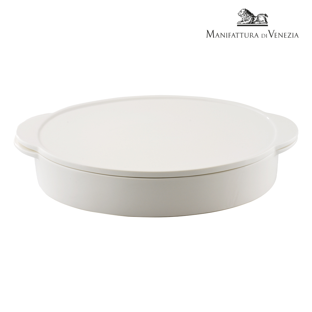 Accessorio duttile e raffinato per chef, Horeca e cucine contemporanee. Il coperchio/vassoio rotondo bianco Pyro Surprise da 24x18 cm è realizzato in vitreous bone porcelain avorio, sinonimo di eleganza e durata. Perfetto come coperchio per pirofile, vassoio per mise en place scenografiche o sottopirofila, resiste a shock termici, graffi, lavastoviglie e si impila con precisione grazie al suo design brevettato. Un elemento multifunzione che coniuga organizzazione, estetica e infinite possibilità di servizio in un solo gesto.
