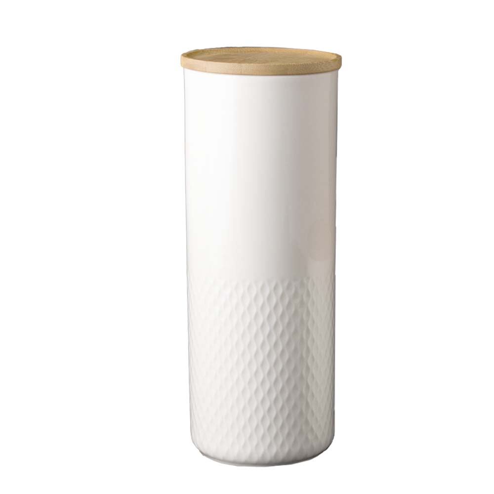 Barattolo impilabile Desco da 1,5 litri, misura 14 x 16 cm, interamente in porcellana alluminosa bianca con coperchio in bamboo ermetico e decorazione a rilievo elegante. Perfetto per conservare alimenti, biscotti, farine o ingredienti sia in cucina professionale che domestica, grazie alla tenuta ottimale e alla facile impilabilità. Resistente a urti, facile da pulire anche in lavastoviglie industriali, offre praticità, igiene e stile moderno designed in Italy per chi cerca soluzioni salvaspazio senza rinunciare all'estetica.